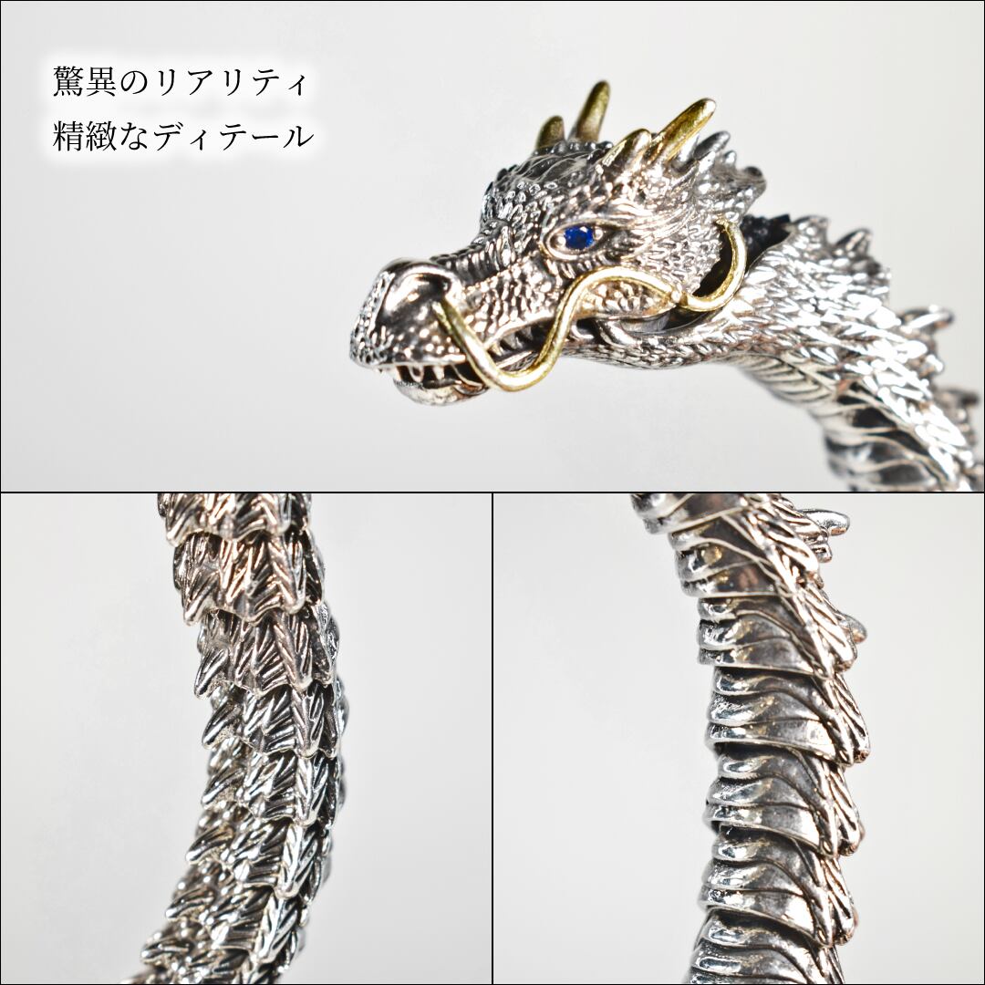 ド迫力の龍の造形が素晴らしい重厚感満点のメタルブレスレットです。龍の体一つ一つに関節があり、本物の龍のように動く自在置物の細工が施され、龍の顔や角、鱗1枚1枚まで精緻に表現された姿はまさに芸術品。目に嵌め込まれたブルーのクリスタルが男のアクセサリーとして存在感を高めます。